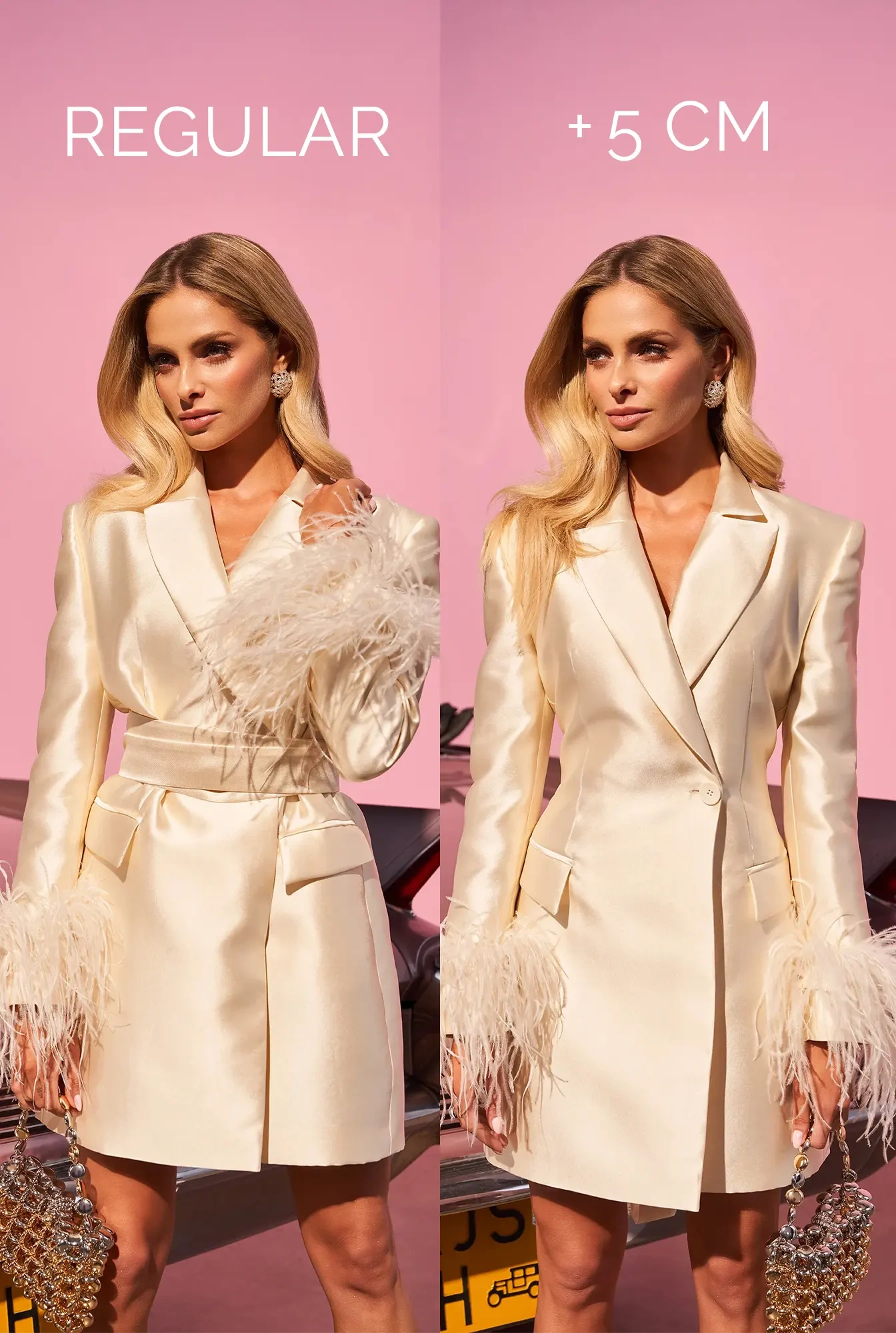 Sehr empfehlenswert, Kleid in einer schönen beige-goldenen Farbe. Durch das leicht gepolsterte Material hat das Kleid eine schöne Passform. Die abnehmbaren Federn geben Ihnen die Möglichkeit, es für verschiedene Anlässe zu stylen. Mit einem elastischen Bund kann man die Taille verstellen. Ich habe die größere Variante gekauft und das Kleid hat bei einer Körpergröße von 162 cm die perfekte Länge bis zum Knie.
