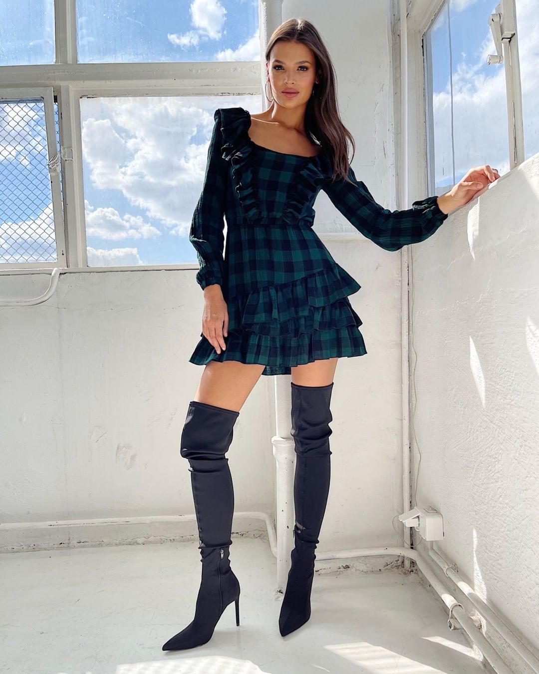 Ein cooles und hübsches Kleid für den Alltag. Hat keinen Wow-Effekt, ist aber sehr bequem. Ideal für den Herbst, das Material ist angenehm zu tragen. Ich empfehle eine kleinere Größe zu nehmen. Die Länge ist mini, aber ok, wenn man 173 cm groß ist. Die Rüschen machen die Hüften nicht breiter, es ist wirklich sehr schön.