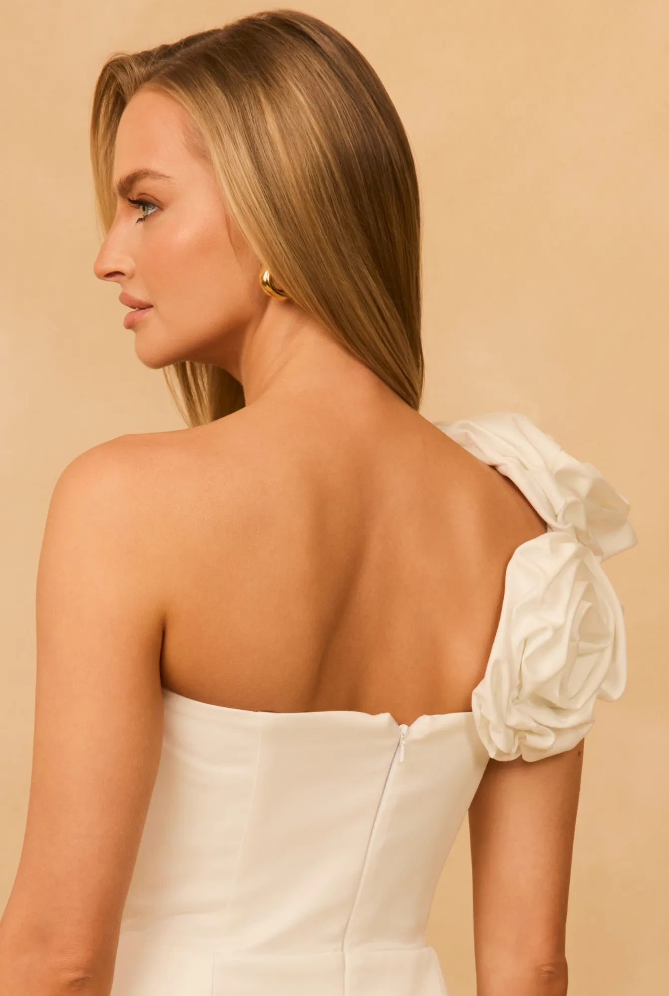 Tinsley ist ein elegantes Kleid aus glattem, leicht dehnbarem Stoff mit dezentem Glanz, das sich perfekt der Figur anpasst. Die korsettartige Oberseite mit Stäbchen und elastischem Band mit Häkchen stützt die Brust zuverlässig, betont die Taille und sorgt für Komfort, während der A-Linien-Rock Leichtigkeit und Bewegungsfreiheit verleiht. Der asymmetrische Schnitt und die handarrangierten Blumen schaffen einen effektvollen, aber eleganten Look. Das Modell in Ecru ist die ideale Wahl für Hochzeiten, Empfänge und andere besondere Anlässe.