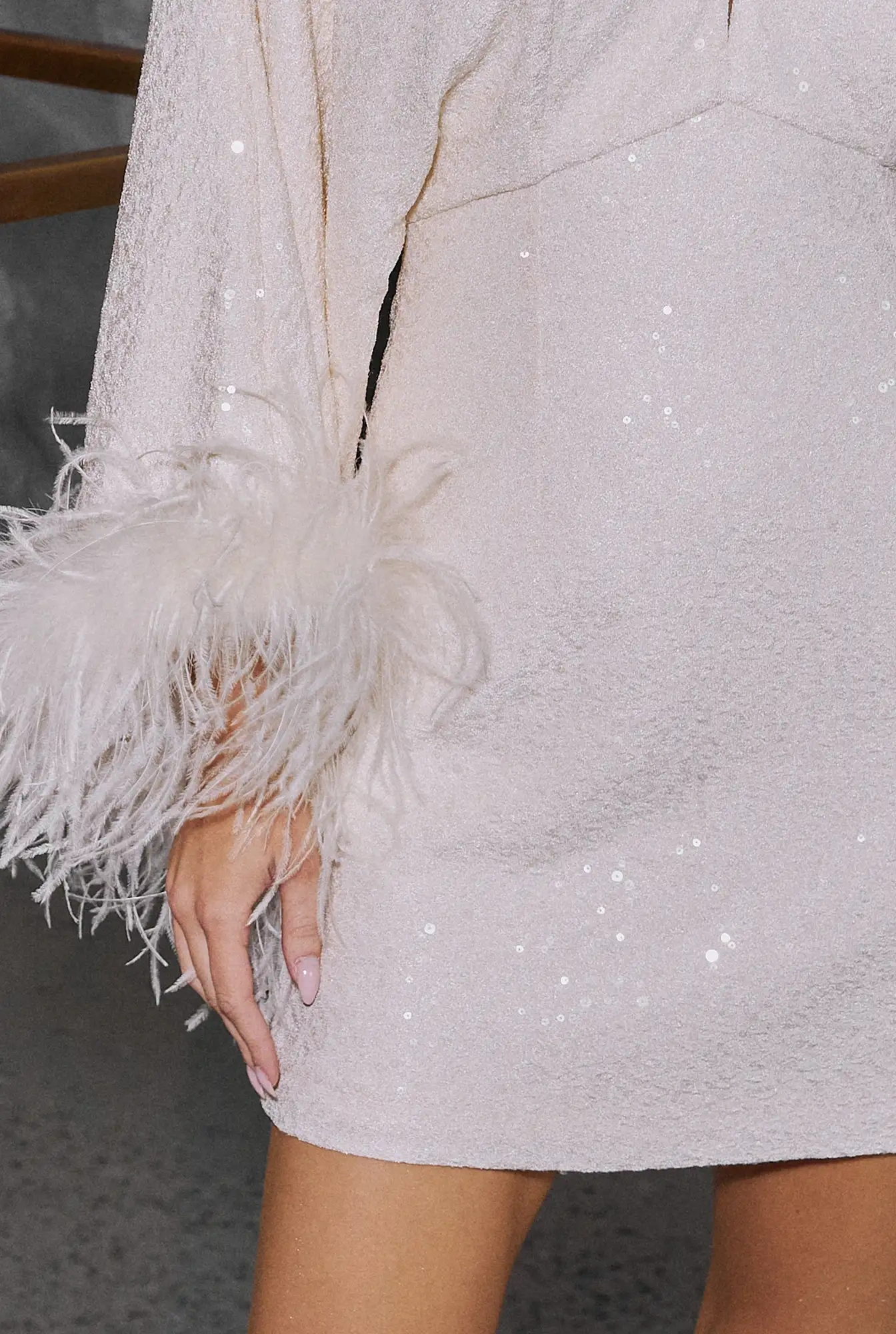 Toluca – ecrufarbenes Minikleid mit Pailletten und Federn