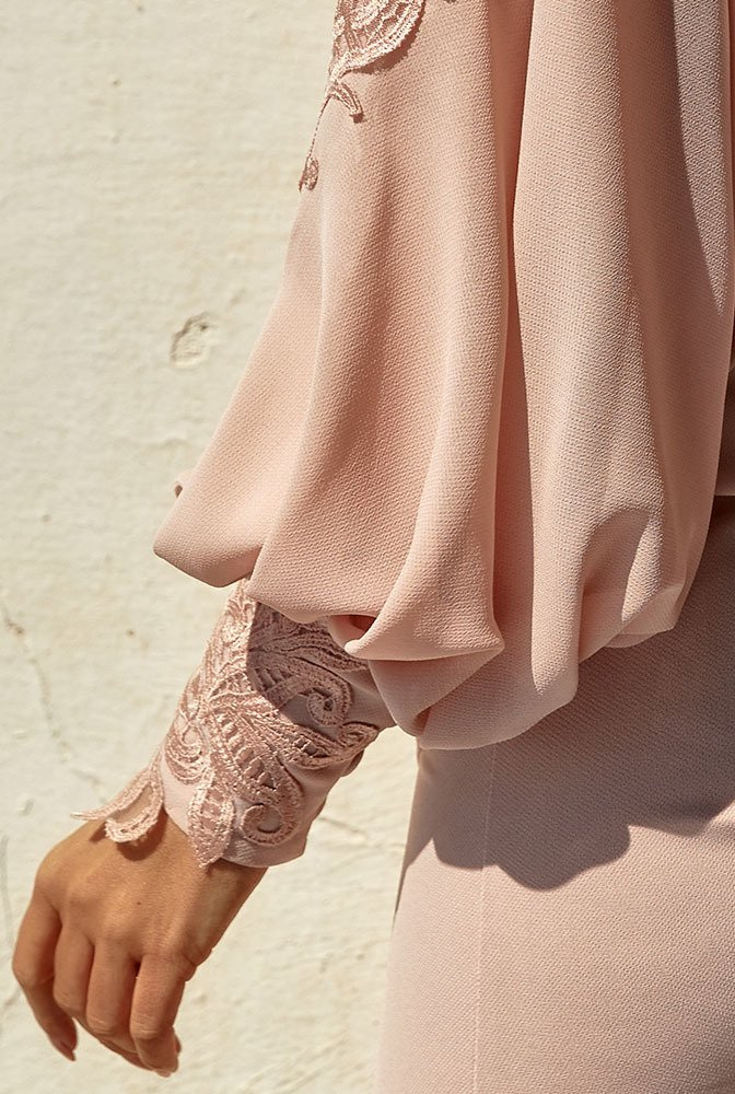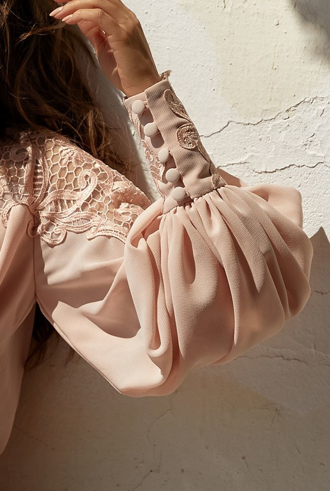 The delicate color combined with exclusive embroidered elements allowed LOU to design the unique Campbell dress. This mini version is one of the most elegant products that can be found on our offer. Delicate pastel pink, a sheer fabric and lacy ornaments - all of these incorporated in Campbell. The puffed sleeves have been adorned with eye-catching tapering elements with decorative buttons. Shoulders, sleeves and welts are trimmed with embroidered ornaments.