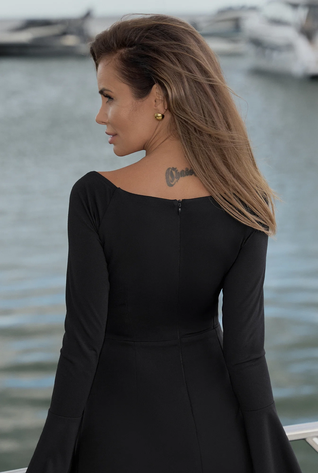 Emeline in classic black combines a modern cut with feminine details. The asymmetrical design highlights the unique character of the piece, while the decorative floral appliqué adds a refined touch – you can detach it to adapt the look to the occasion. Made from stretchy fabric with added viscose, it fits the silhouette perfectly and ensures comfort. The reinforced hem gives the dress an elegant shape and a slightly flared effect. Elastic inserts in the sleeves prevent the dress from slipping off the shoulders, and the zip fastening makes it easy to put on. This model is perfect for evening events as well as special occasions when you want to look both stylish and sensual.