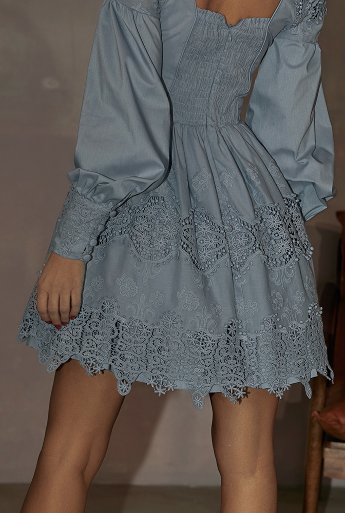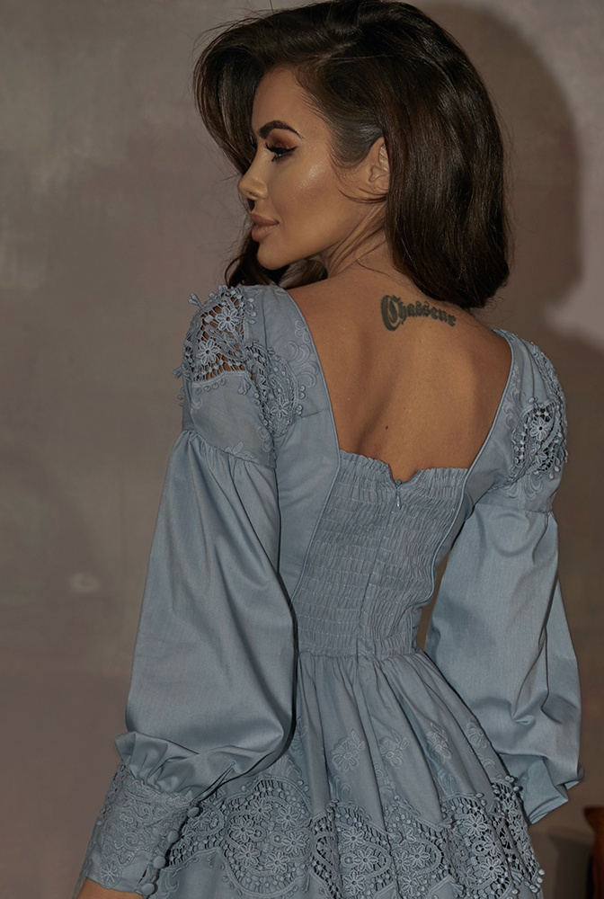 • A blue boho dress with decorative embroidery on the shoulders, sleeves and at the bottom of the dress. A neckline in the letter "V". An elastic band on the back that adjusts to the body shape. Fastened back to the zipper.