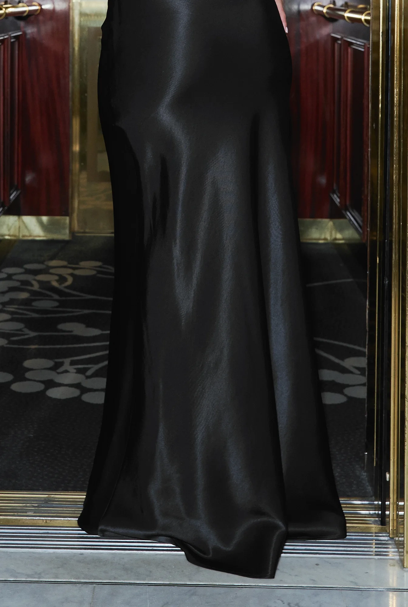 Lenox is a two-piece black set with a modern character. It consists of an asymmetrical corset and a long skirt, creating an exceptionally chic outfit perfect for evening occasions. The corset is made of a shiny viscose fabric that beautifully reflects the light and subtly highlights the shoulder line. A striking draped panel falls to one side, forming an elegant asymmetrical silhouette. The corset fastens with a zipper, ensuring a perfect fit to the body. The long skirt drapes softly along the figure and creates a flowing line in motion. The waistband features an elastic lace insert that provides comfort and an ideal fit. The entire set looks very harmonious – the shiny fabric, the smooth form of the skirt and the corset’s asymmetry create an elegant yet bold and modern ensemble.