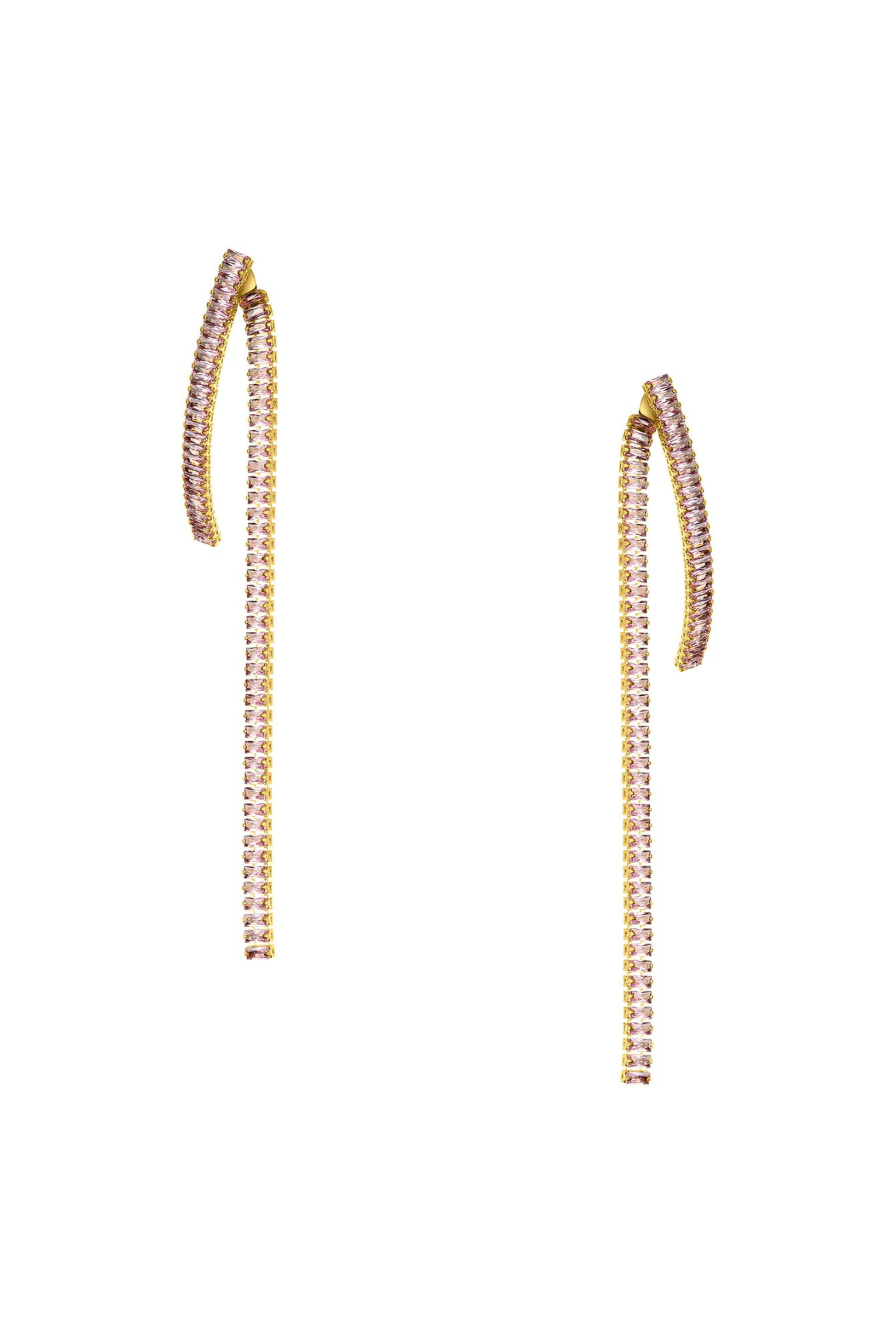 These impressive long earrings made of gold-plated copper are the essence of elegance and sophistication. The design gives them lightness and subtle movement, which attracts attention with every step. The main decorative element are beautiful pink crystals, which add romantic charm and unique shine.