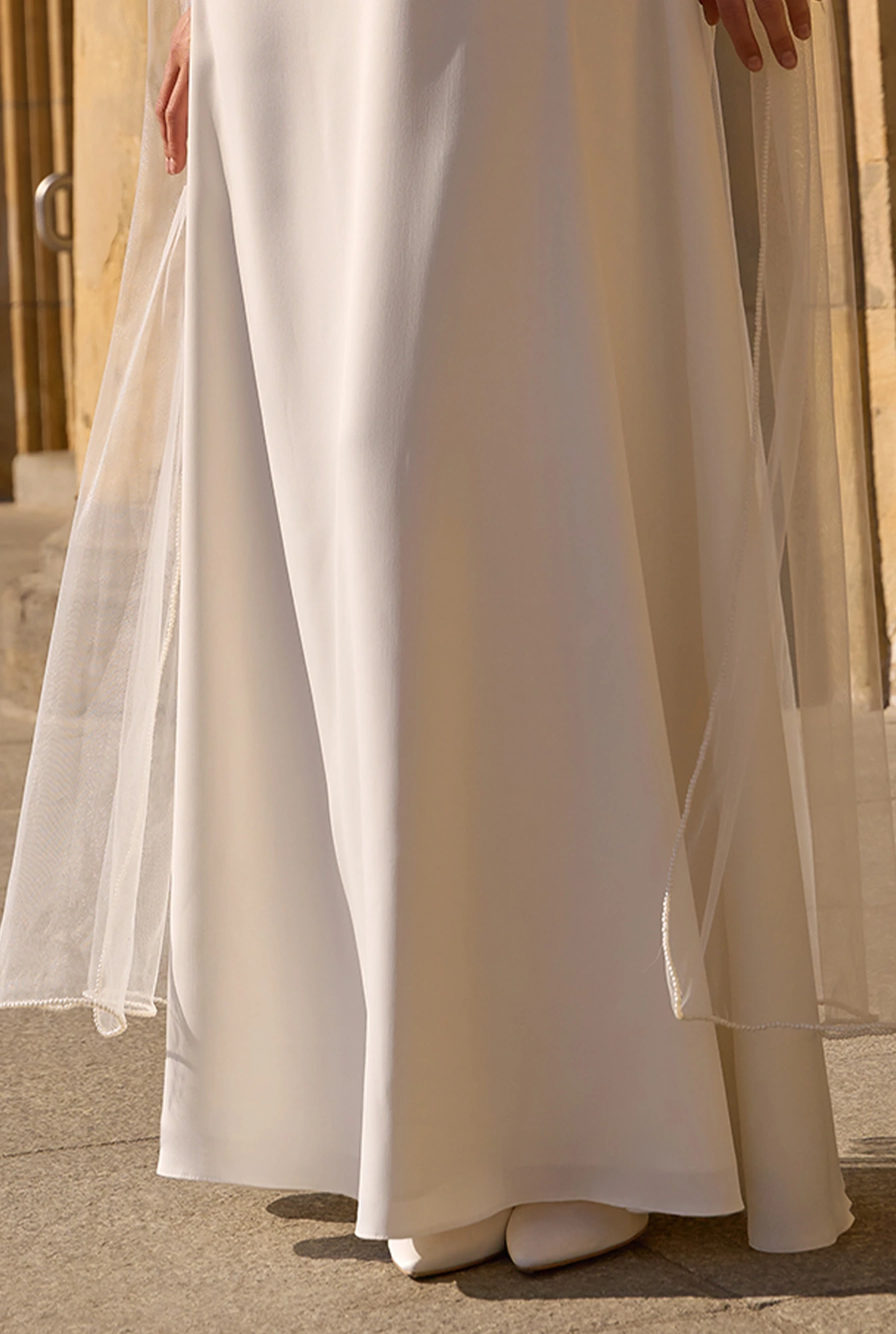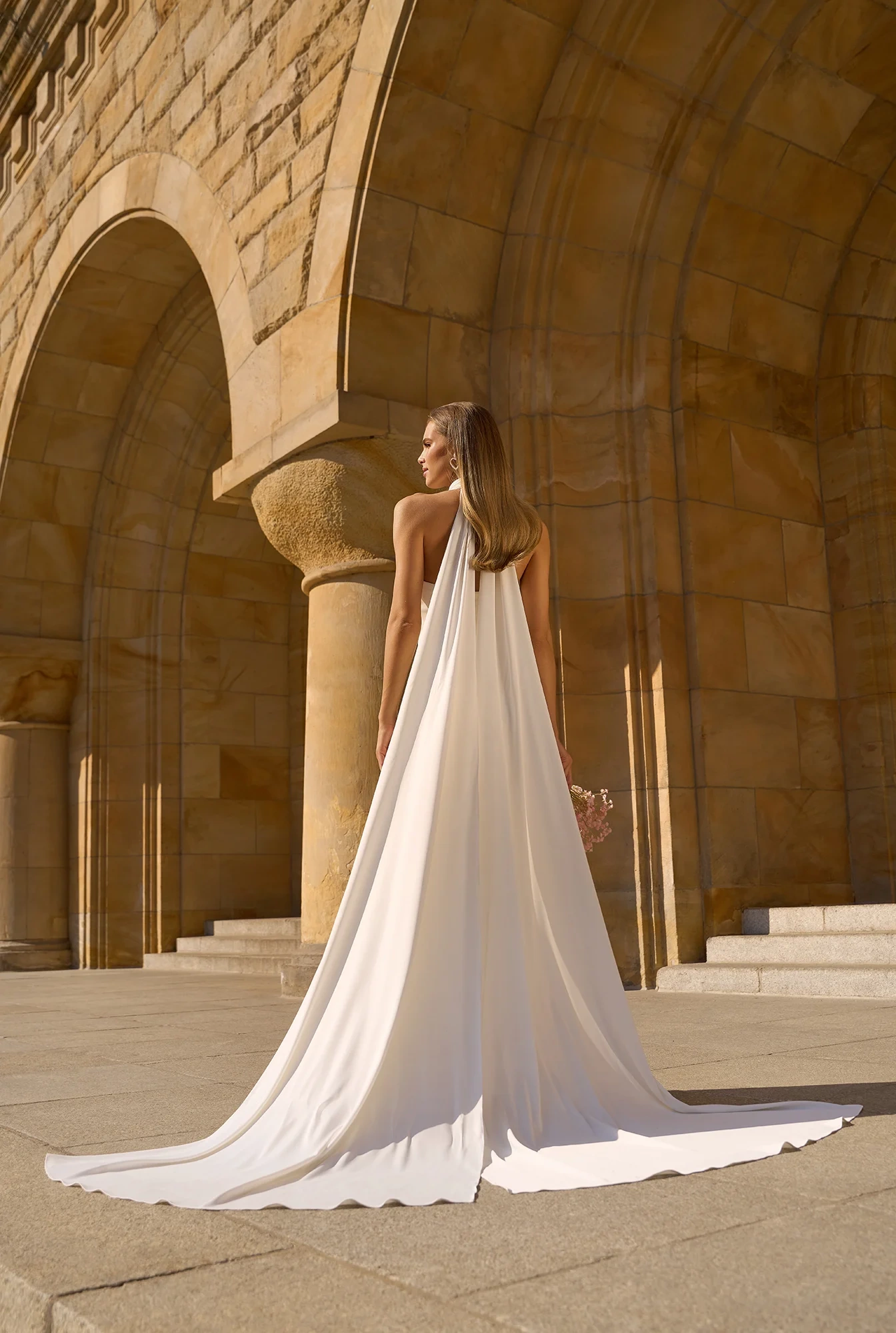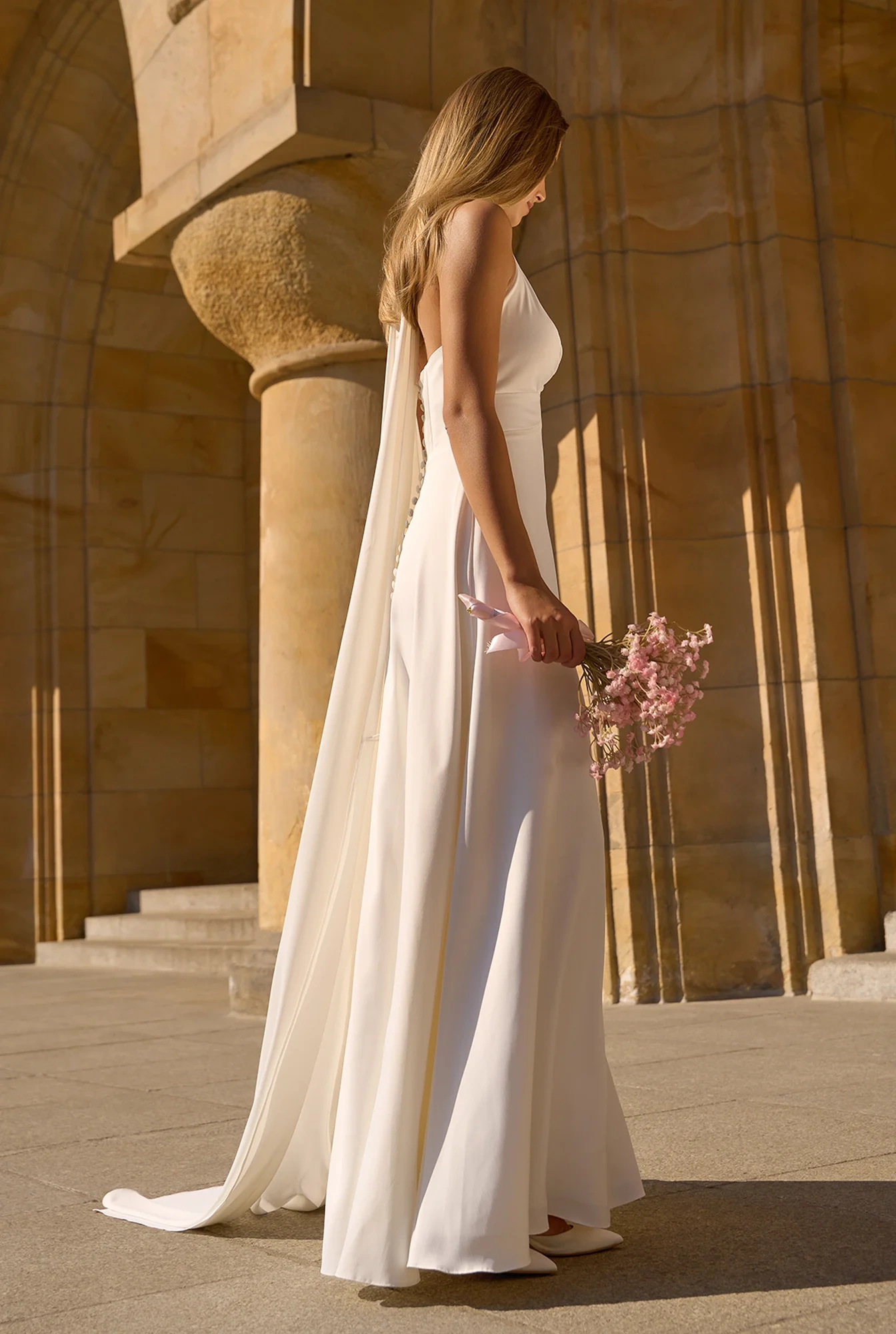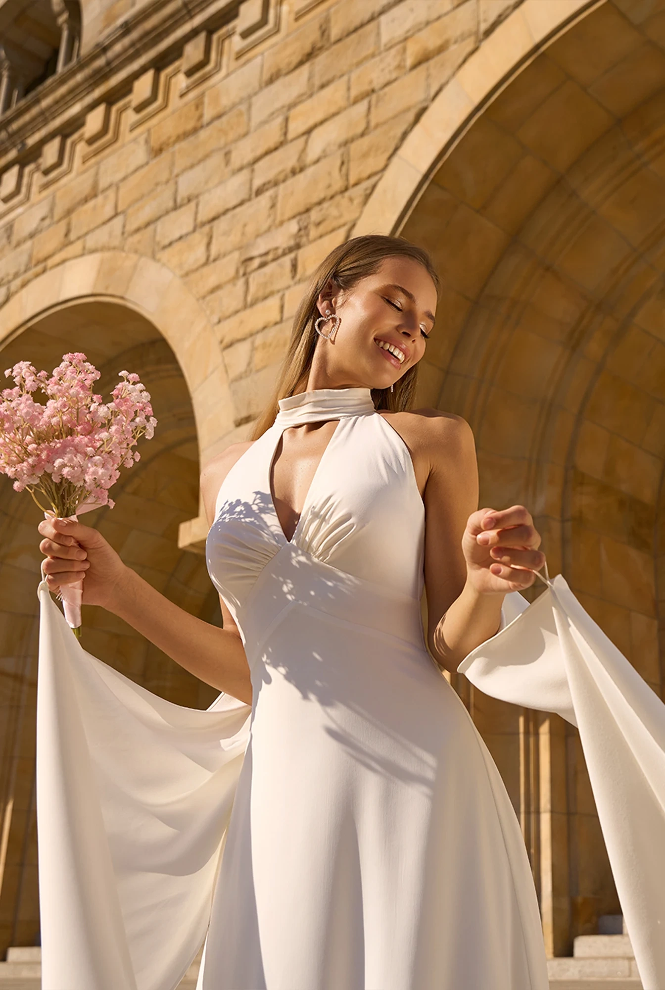 A maxi dress designed for special occasions. The model impresses with its flared hem and detachable shawl, adding lightness and elegance to the look. The dress is crafted from double-layered, high-quality fabric that drapes beautifully and ensures maximum comfort. The back features an elastic band with hooks — providing perfect bust support without compromising comfort. Delicate zip and button fastening completes the design. A perfect choice for an evening, gala, or special event.