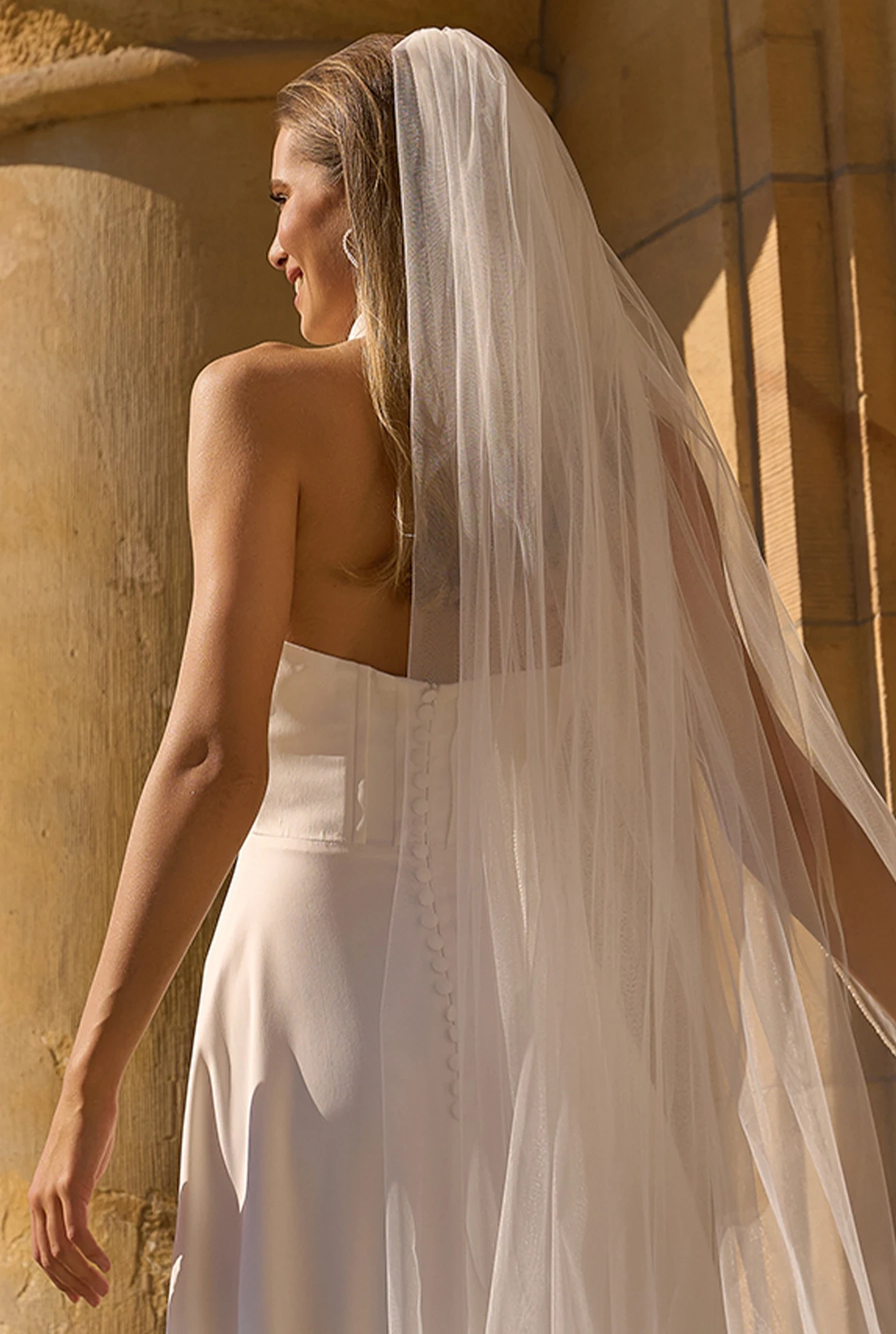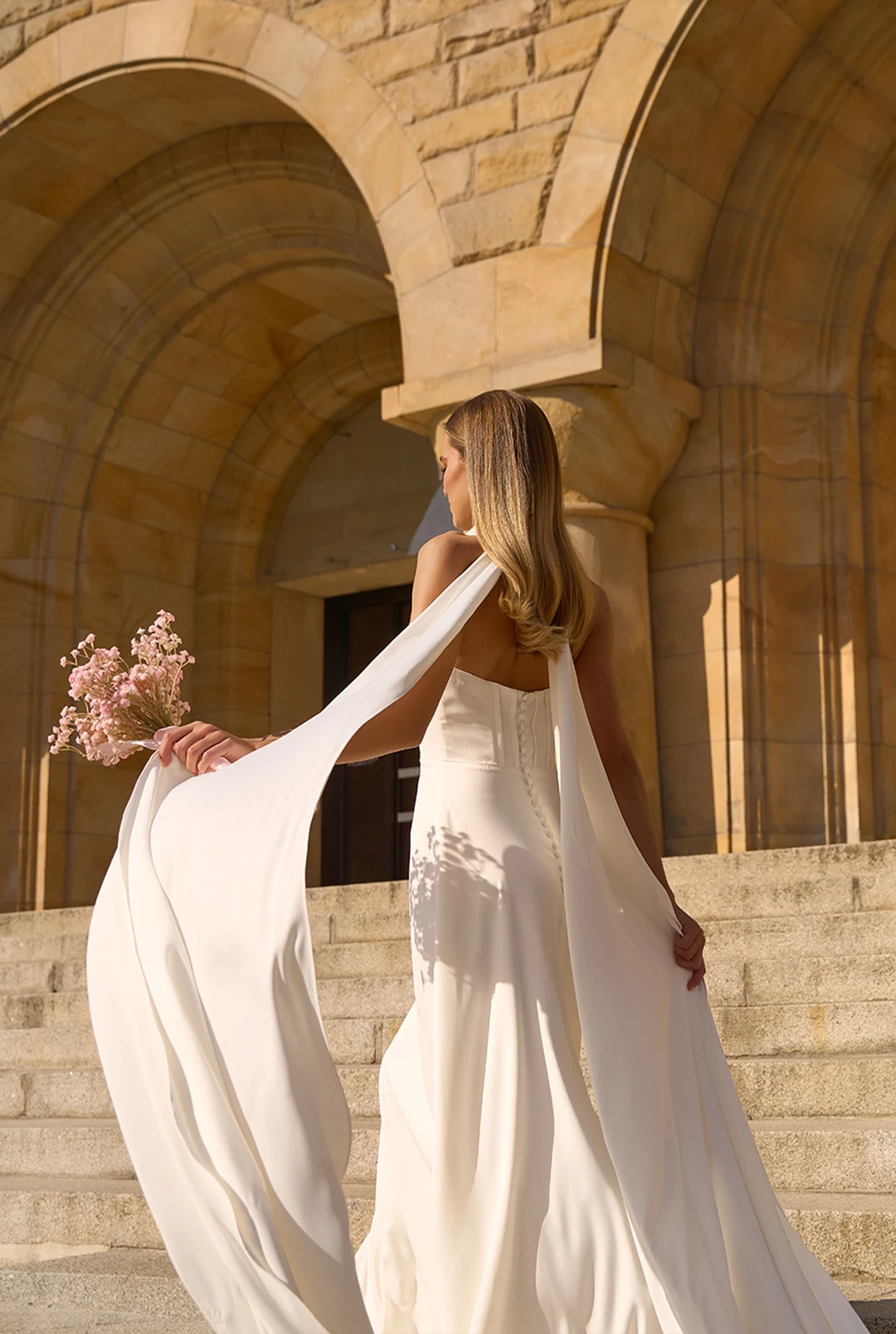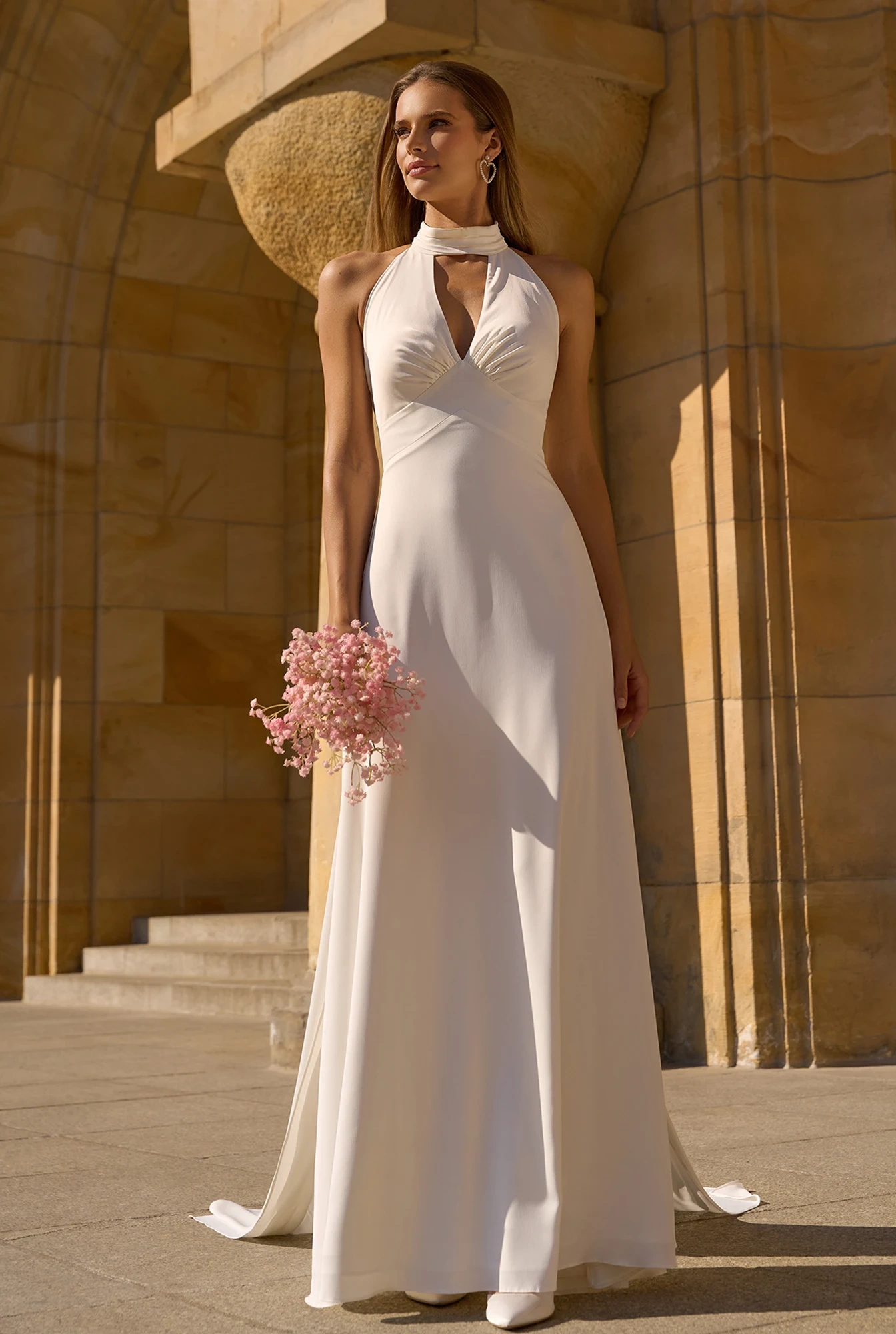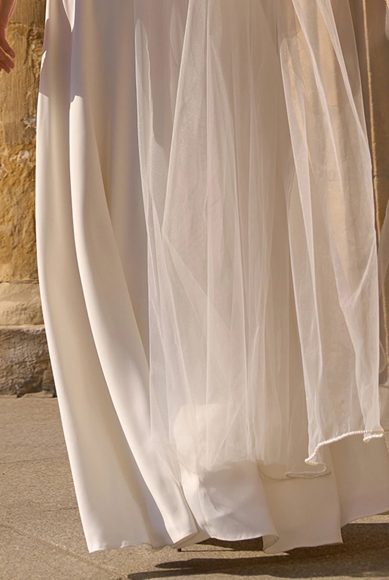 A maxi dress designed for special occasions. The model impresses with its flared hem and detachable shawl, adding lightness and elegance to the look. The dress is crafted from double-layered, high-quality fabric that drapes beautifully and ensures maximum comfort. The back features an elastic band with hooks — providing perfect bust support without compromising comfort. Delicate zip and button fastening completes the design. A perfect choice for an evening, gala, or special event.