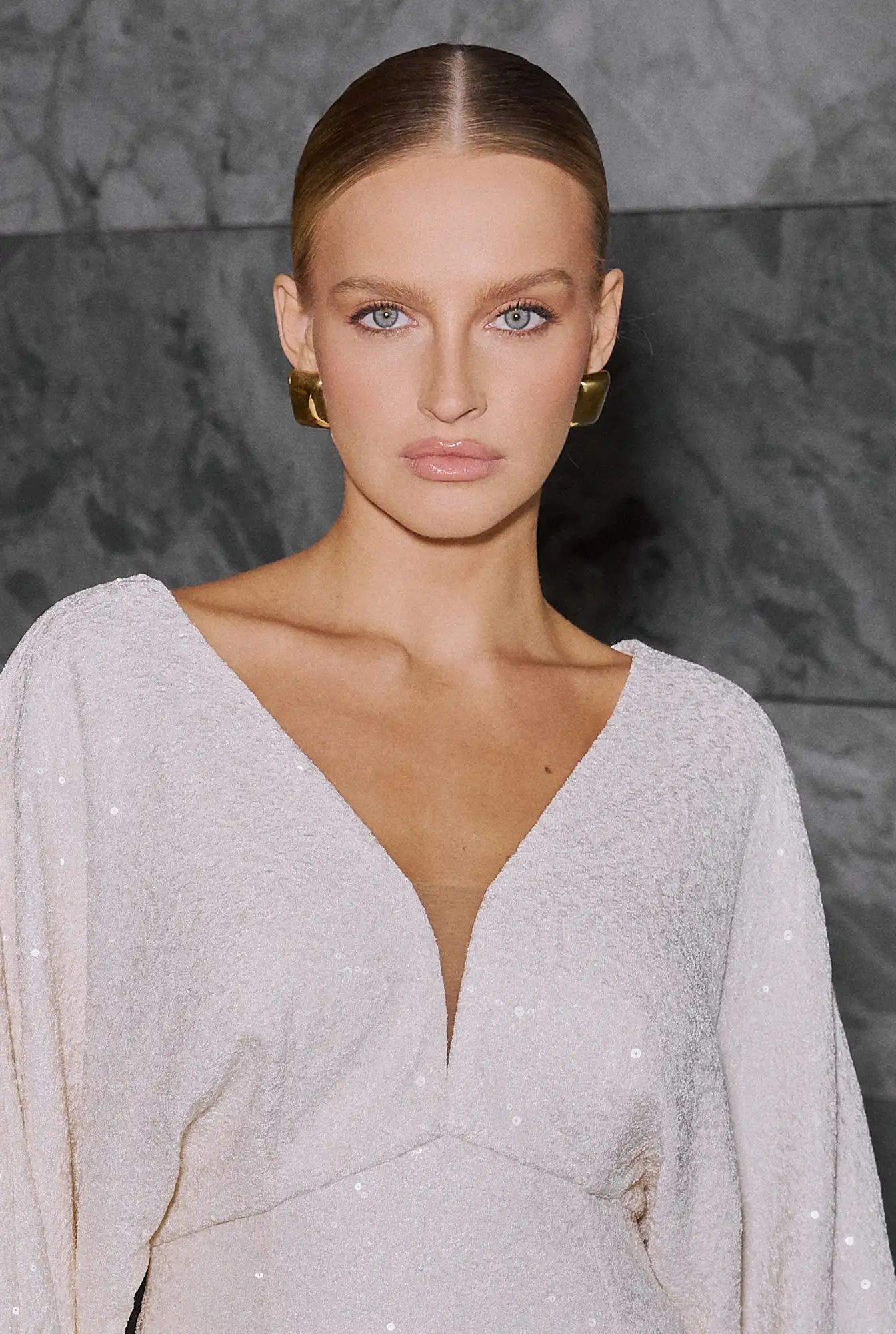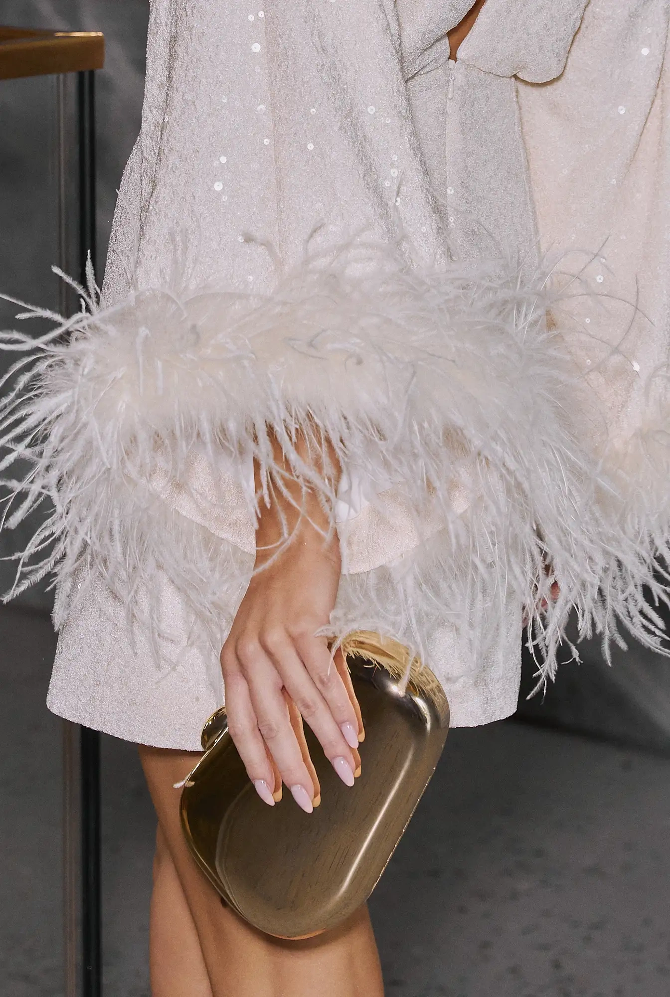 Toluca is an elegant ecru dress adorned with subtle sequins that add a gentle shine. The back features an eye-catching neckline with a romantic tie, while the long, flared sleeves finished with feathers draw attention and add lightness to the silhouette. The dress is lined and fastens with a zipper, ensuring comfort while wearing. Perfect for Christmas celebrations, New Year’s Eve, and special occasions.