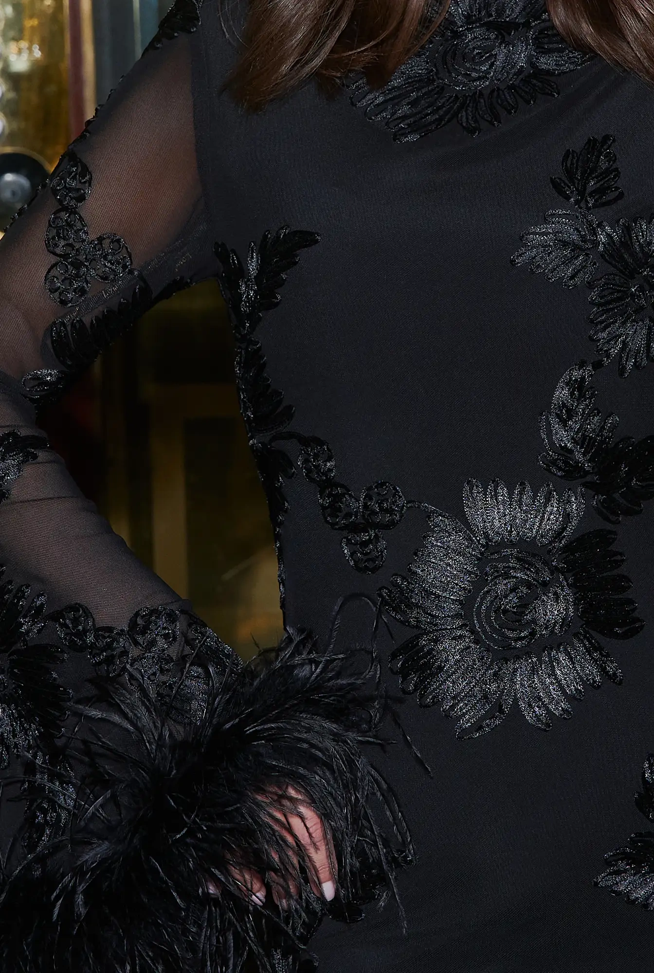 Unella – black mini dress with feathers