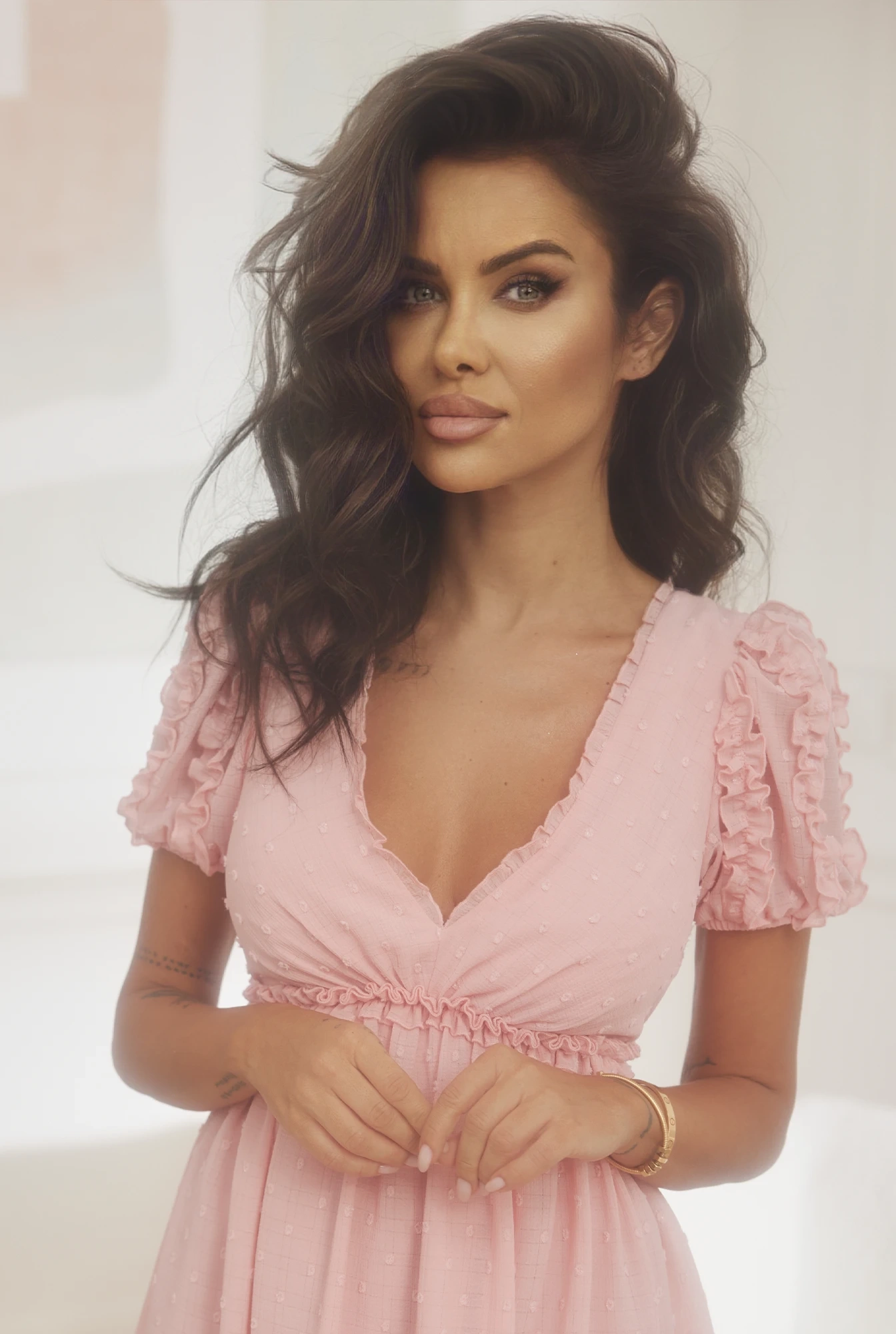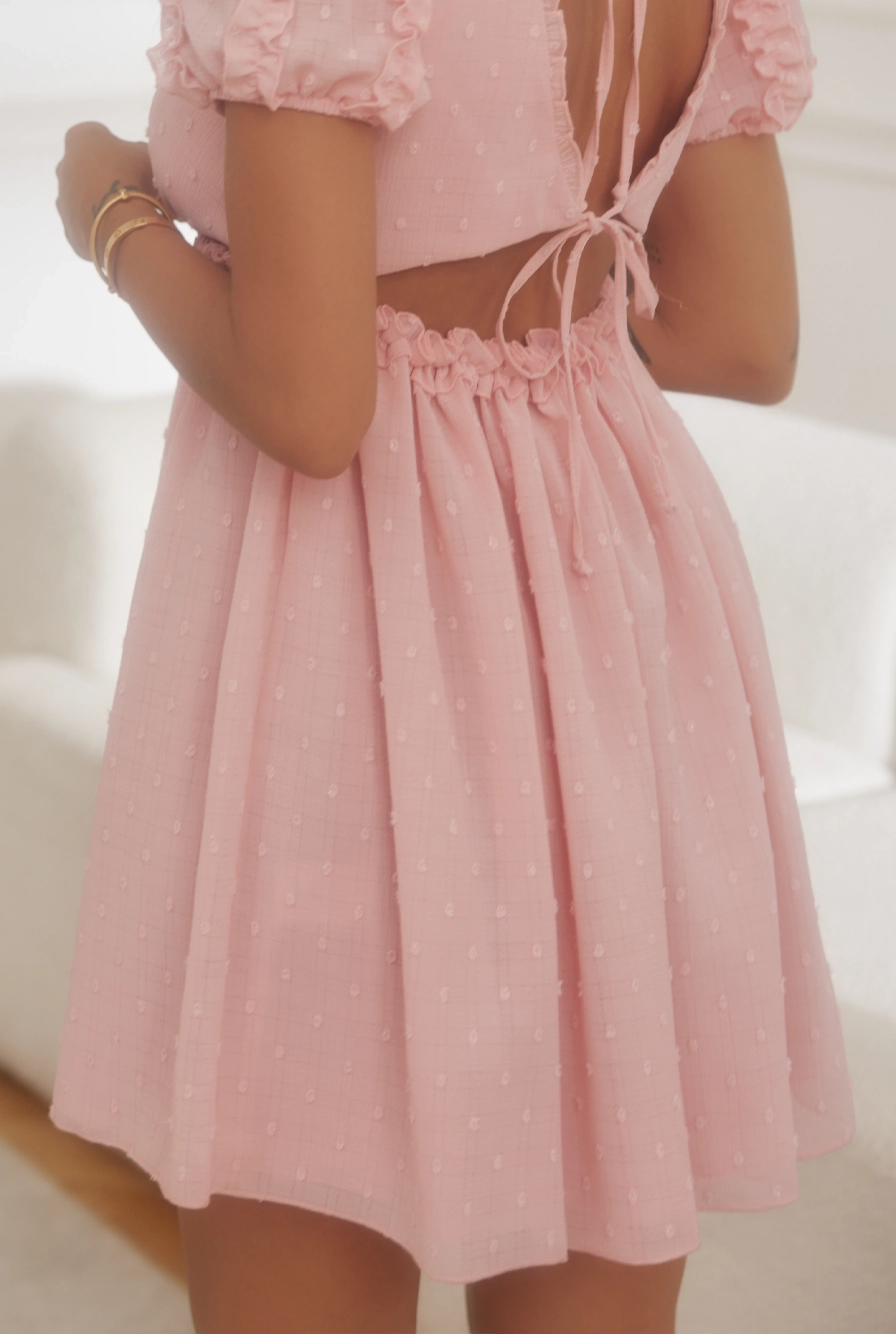 • Phenomenal mini dress in powder pink. Elastic waist, semi-sheer fabric with embossing, buffets, ruffles. Perfect for spring, summer occasions, Valentine's Day, date, birthday. Comfortable and stylish!